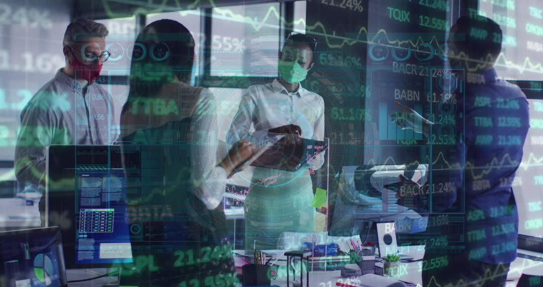 Diverse coworkers in protective masks conducting a meeting with overlapping digital financial graphics. Highlights blend of modern technology with business environments focused on teamwork and communication during challenging times. Useful for illustrating concepts of corporate productivity, technology integration, and adaptable business practices amid global changes.