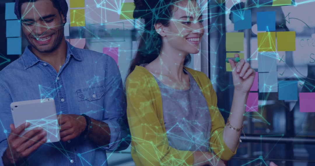 Business professionals collaborating in an office with a digital network overlay symbolize innovation and teamwork. Ideal for advertising technology in collaborative environments, emphasizing modern business strategies, digital transformation, and future company advancements.