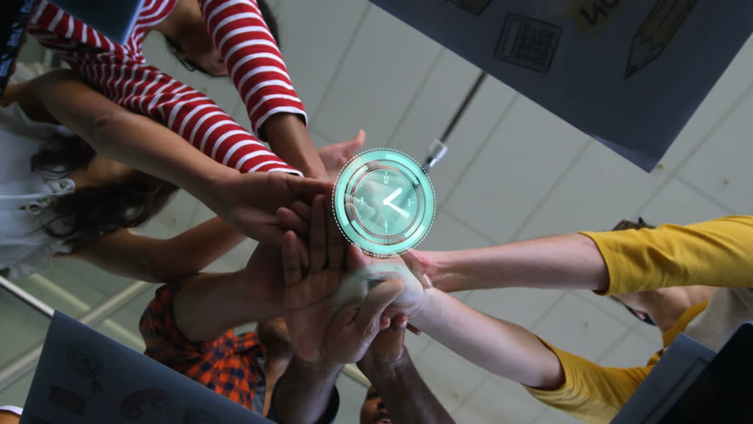 Individuals placing hands together, symbolizing teamwork and unity. Digital graphics overlay suggesting collaboration with technological advancements. Suitable for concepts of future workplaces, digital collaborations, and innovative teamwork solutions.