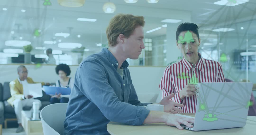 In a bright, modern office setting, two colleagues are engaging with visuals projected over a laptop, illustrating a network structure. This scenario depicts collaboration as they exchange insights and ideas about IT solutions or network designs. Use this for content highlighting workplace innovation, IT strategies, or collaborative teamwork in tech industries.