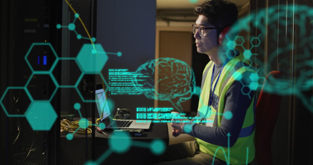 Asian male engineer analyzes AI data using a laptop in a server room. Virtual elements and graphics overlay, conveying themes of advanced technology and cybersecurity. Suitable for technology industry, AI research presentations, and cybersecurity topics.