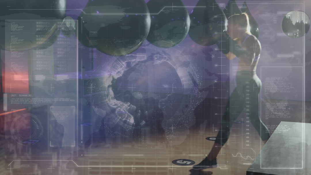 Woman is engaged in boxing exercises in a futuristic gym surrounded by digital data projections. Great for tech and fitness themes, illustrating innovation in sports environments, or promoting futuristic athletic training programs.