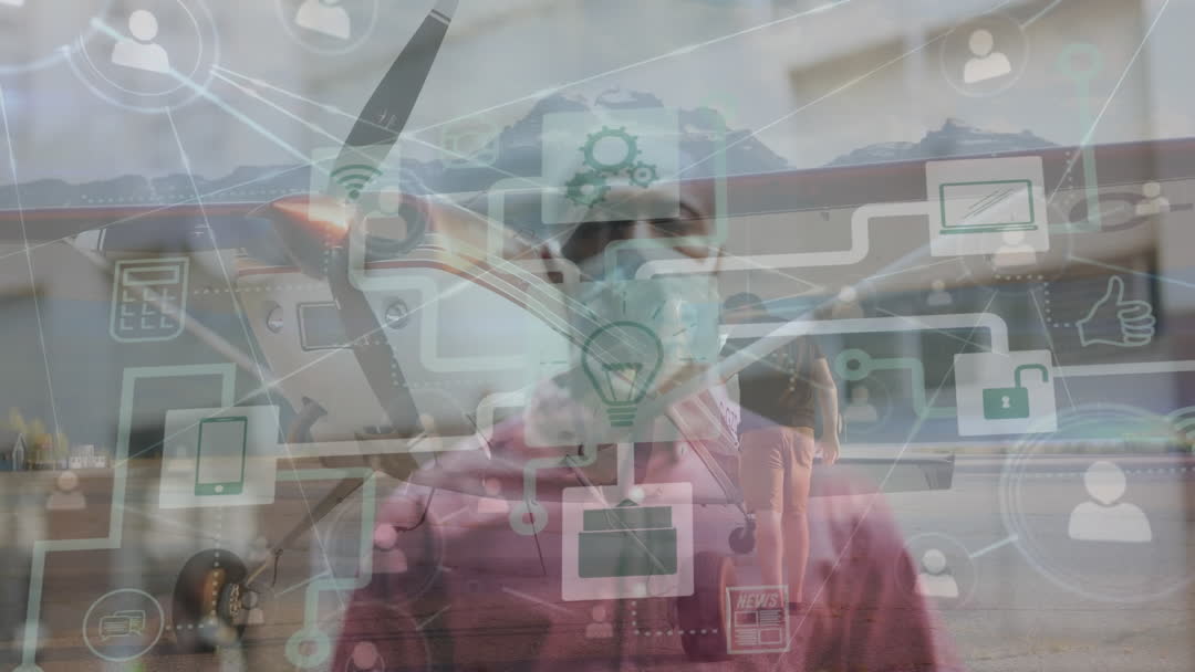 African American man wearing a face mask stands in front of small airplane, overlaid with digital network icons depicting concepts like connectivity, innovative technology, safety, and communication. Could be used for illustrating modern air travel adaptations, tech in aviation, or safety measures during the pandemic.
