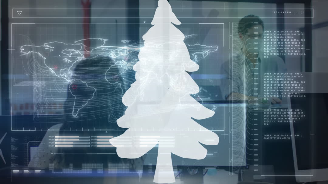 Diverse business professionals in face masks analyze a high-tech digital screen featuring a tree graphic. Representation of adaptation and resilience in business environments during the COVID-19 pandemic. Suitable for articles or presentations on technology innovation, workplace adaptations, or pandemic impact on business practices.