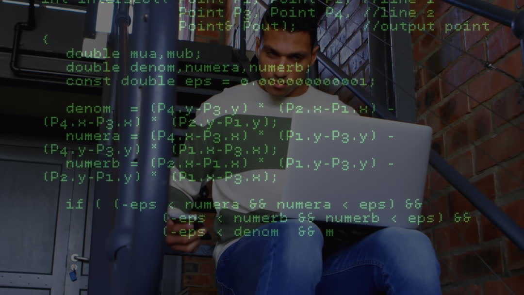 Man using laptop and smartphone with overlaid programming code implies multitasking in digital business. Symbolizes tech-driven innovation, suitable for stories on global connectivity, fintech, or career growth in technology.