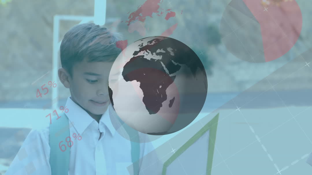 Young boy in school uniform visually overlaps with digital animations. The scene depicts educational advancements in technology with elements like a spinning globe and data metrics. Ideal for depicting modern learning environments, promoting digital education tools, or illustrating futuristic classroom settings.