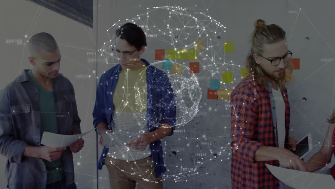 Coworkers gather in modern tech office, reviewing documents amidst digital network overlay visualizing connectivity. Suitable for illustrating themes of teamwork, innovation, and modern business practices. Ideal for businesses highlighting collaborative environment or technological advancement.