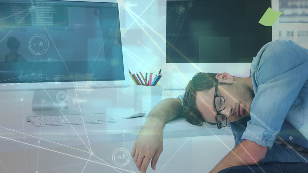 Man sleeping at office desk overlaid with technological network graphics, highlighting concept of exhaustion from digital workload. Represents technology overload in professional environment. Useful for articles or discussions on work-life balance, employee well-being, and impact of technology on workplace health.