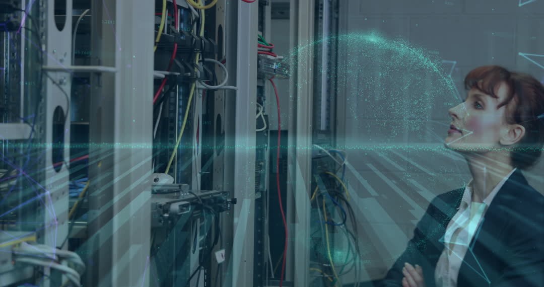 Woman IT professional analyzing servers with a digital hologram overlay showcasing global connectivity and data visualization. Useful for illustrating modern data centers, network solutions, and international technology infrastructure projects.