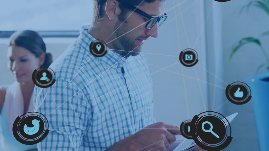Scene captures tech professional using tablet surrounded by digital connections symbolized by floating icons representing communication and workflow. Depicts cutting-edge technology and modern work environments. Ideal for use in content about technological innovation, digital productivity tools, and office communication strategies.
