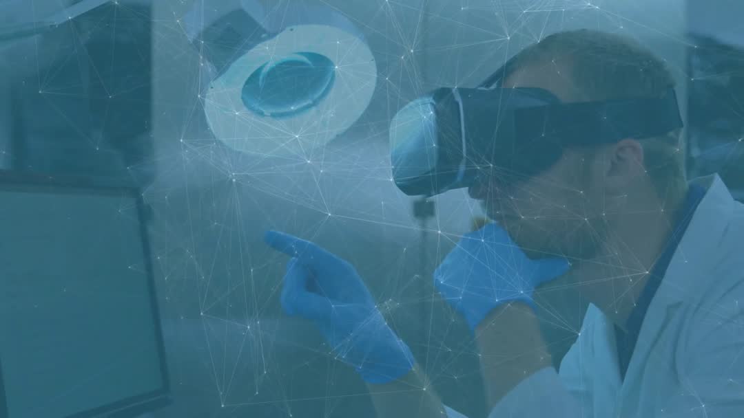 A tech researcher in a lab coat uses a VR headset to analyze data in a laboratory setting, reflecting a futuristic and immersive approach. The digital network overlay symbolizes advanced technology and innovation in scientific research. This video can illustrate themes related to scientific innovation, technological advancement, and virtual reality in academic or commercial presentations, articles, and promotional materials for tech companies.