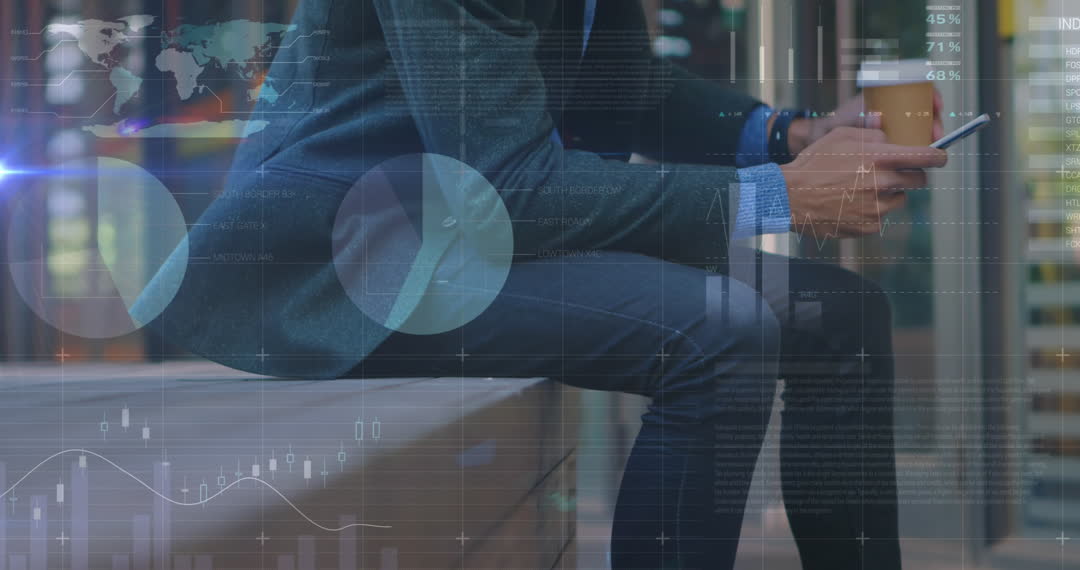 A businessman in a suit sitting while analyzing financial data on his smartphone. Various graphs and charts overlay the scene, signifying digital transformation and technological innovation. Useful for themes involving modern finance, technology in business, and data analytics.