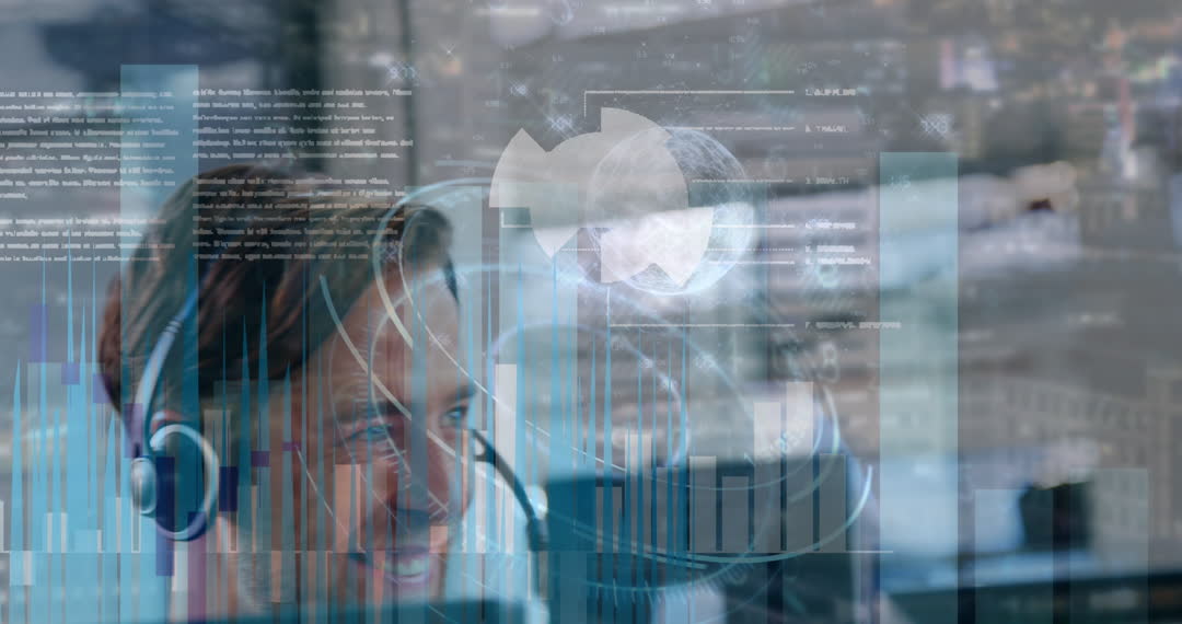 This visual depicts a confident call center worker with financial graphs superimposed, symbolizing the fusion of customer service with data analysis. Perfect for illustrating concepts in modern business solutions, digital call center operations, or technology-enhanced customer engagement. Ideal for use in presentations related to finance tech, remote working solutions, or service economy updates.