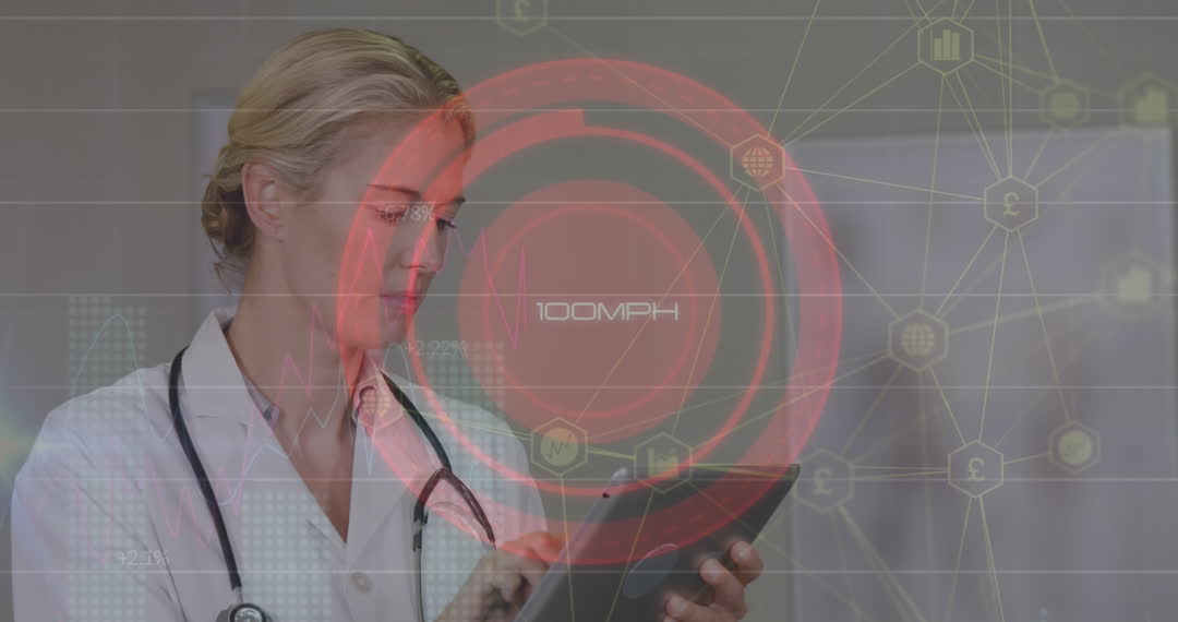 The composition features a doctor interacting with a digital tablet while futuristic icons and graphics including a speedometer overlay suggest cutting-edge medical technology. Helpful for promoting smart healthcare solutions, digital health technology firms, or medical publications focused on innovation and advancements in healthcare.