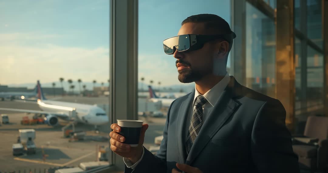 AI Generated Image. A man stands near an airport window drinking coffee while wearing an AR headset, suggesting a blend of travel and modern technology. Ideal for illustrating future travel experiences, technology integration, and business-oriented lifestyles in advertising, blog posts, or articles about innovation, virtual reality, and connectivity.