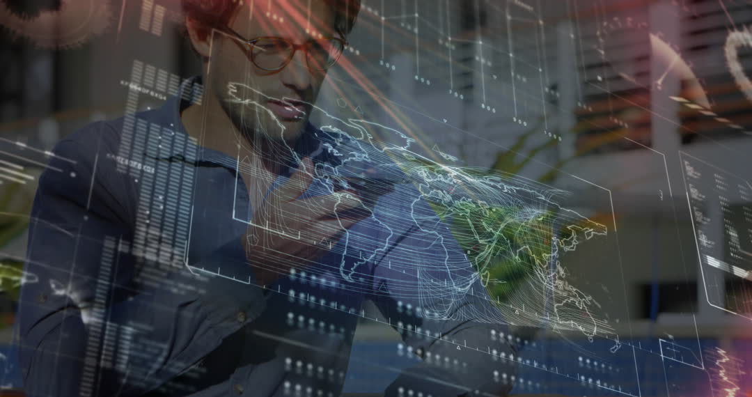 This depiction of a professional interacting with global data highlights modern communication in the tech industry. It offers a powerful representation of connectivity useful for illustrating themes of international business, technological innovation, and remote teamwork. Ideal for marketing materials, presentations on digital transformation or articles on global networking.