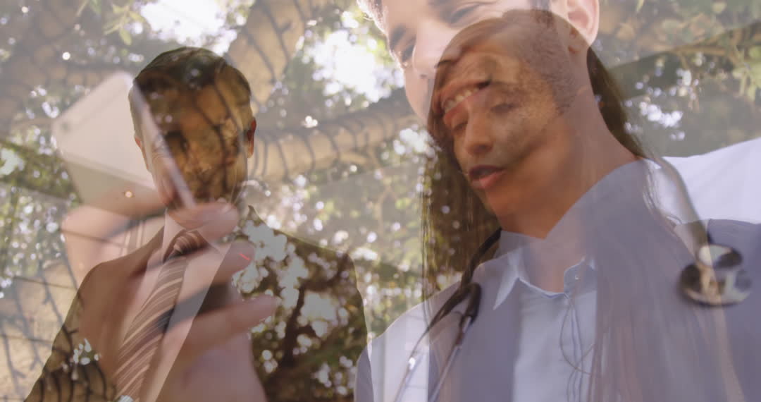 Image creatively illustrates a doctor utilizing a mobile device among trees, suggesting modern healthcare connected with nature. Overlay features a businesswoman and businessman in office attire symbolizing business dialogue. Effective for concepts related to healthcare communication, business partnerships, and modern medicine's integration with environment and technology. Suitable for medical and business-related content that emphasizes eco-friendly innovations and professional cooperation.