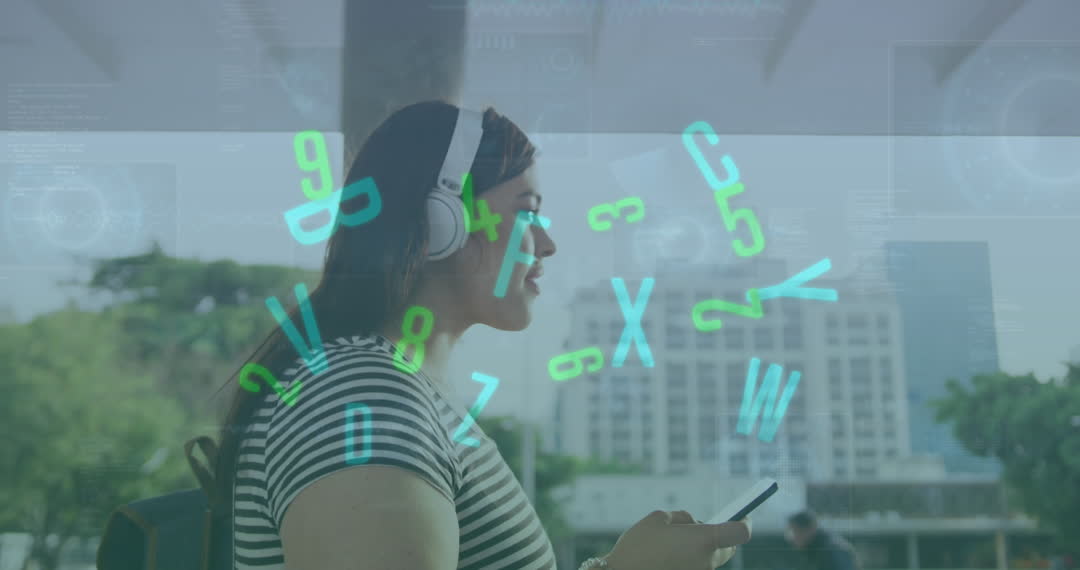 A composite view of a woman immersed in music, walking outside while surrounded by an abstract display of letters and numbers. This mixture of natural and digital elements captures the role of technology in everyday life. Perfect for use in articles or campaigns related to innovation, digital interfaces, tech lifestyle, or modern gadget advertising.