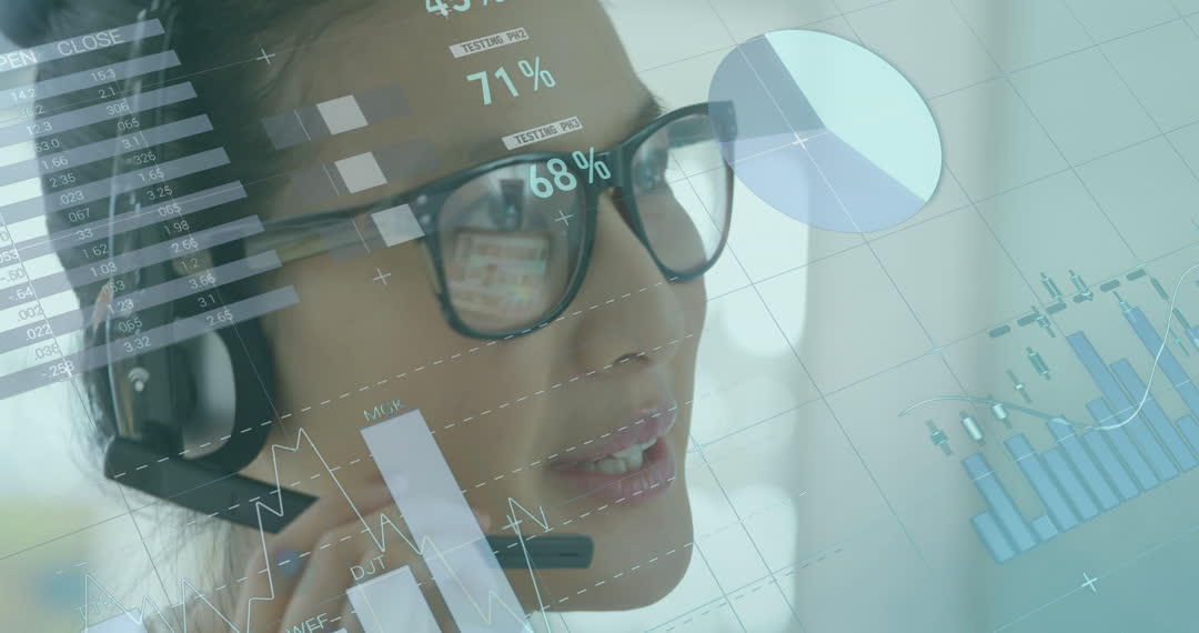 This engaging visual shows a technology support agent using a headset with a transparent layer of data interfaces. Charts, graphs, and percentages are seamlessly integrated, conveying concepts of technical support, data processing, and efficiency. It is perfect for illustrating themes related to digital analytics, tech support, or modern IT operation systems. Ideal for websites, business presentations, or articles focusing on customer service in tech industries.