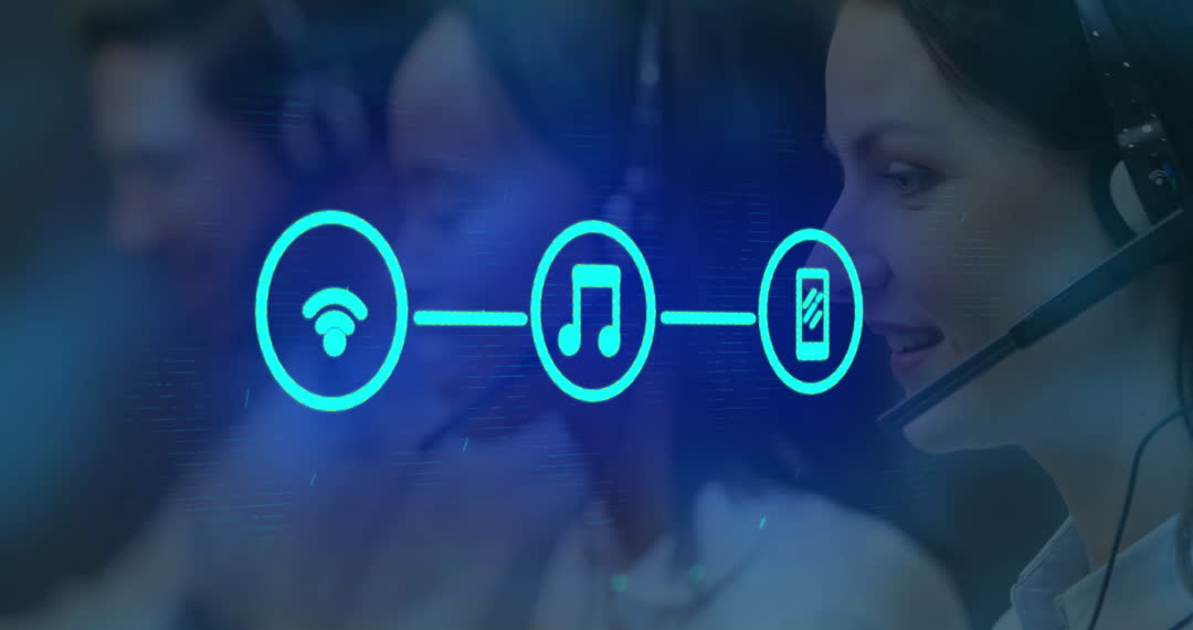 Group of tech support professionals using headsets, highlighting digital icons representing connectivity and multimedia solutions, suggests expertise in communication and technology. Suitable for illustrating customer service efficiency, teamwork, remote assistance themes in technology and business sectors.