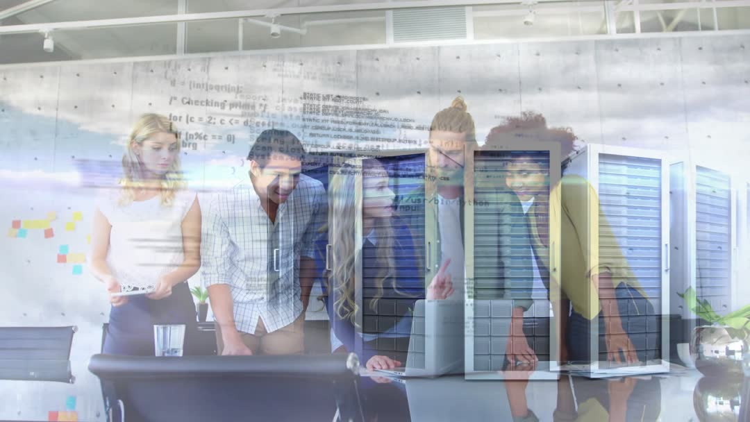 A tech-focused team is gathered in a modern office interior, collaborating over a laptop. A digital code overlay appears as a member interacts with technology, demonstrating innovative and strategic teamwork processes. This scene highlights effective communication and cutting-edge technology in workplace settings. Useful for illustrating concepts of modern business, innovation, tech industry strategies, or corporate team dynamics.