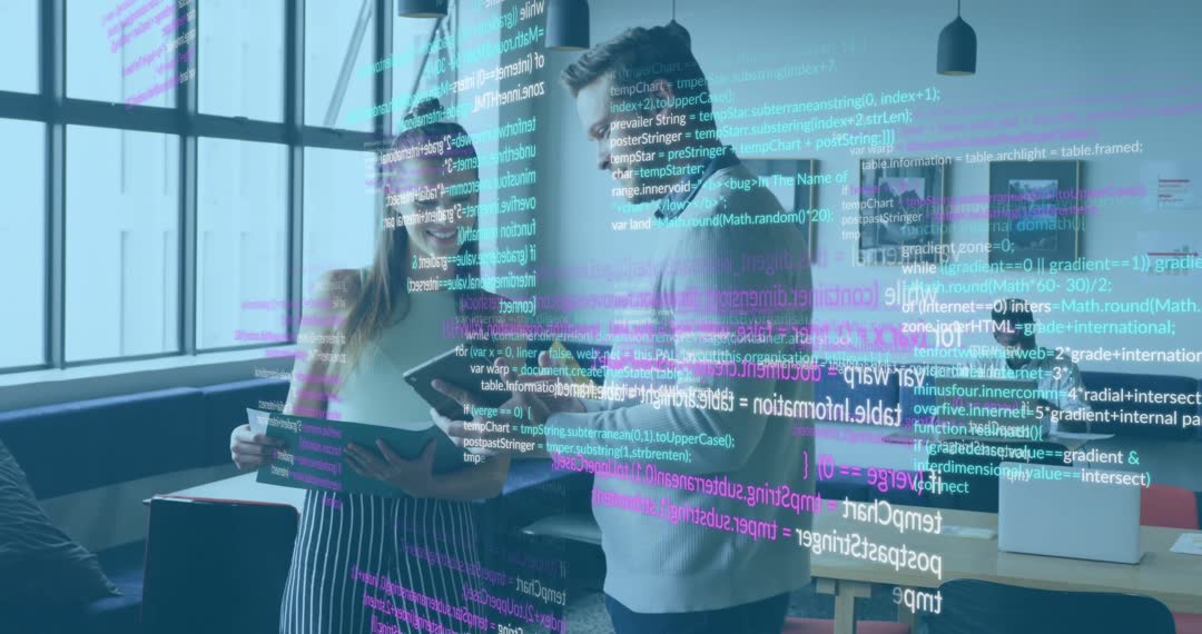In an office environment, two professionals are engaged with a tablet and a folder, while lines of computer code are superimposed in front of them. This visual captures the essence of innovation and digital advancement, highlighting teamwork in modern workplaces. This visual can be effectively used in articles or presentations focusing on digital innovation, team collaboration, and modern office environments, expressing ideas of productivity, synergy, and cutting-edge technology.
