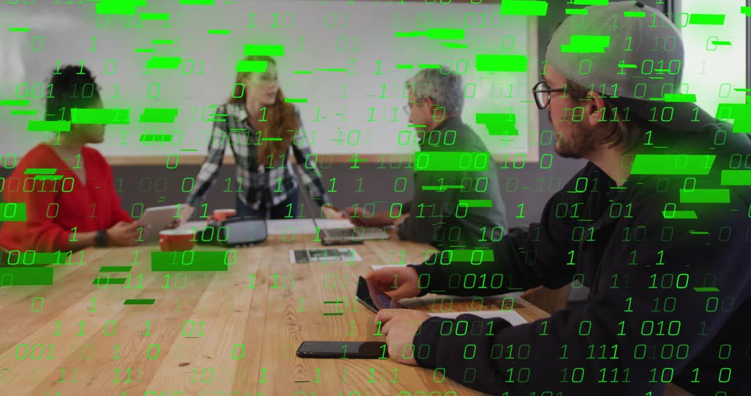 Scene depicts business professionals engaging in important technology-focused meeting. Cascading digital data in background symbolizes interruption by cybersecurity alert or digital transformation challenge. Valuable for use in materials related to cyber security training, teamwork dynamics, technology integration, or promotion of innovative collaborations within professional settings.