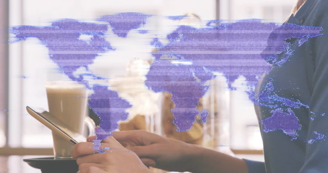 This video captures a woman interacting with a tablet in a cafe while digital technology emulates a global connectivity theme. The world map overlay signifies data technology merging with everyday activities. Use it for themes such as remote work, tech-driven lifestyle depictions, or illustrating the merge of global reach with personal device usage, ideal for educational technology contents or advertisements for digital products and services. The warm cafe environment adds a cozy, approachable feel.