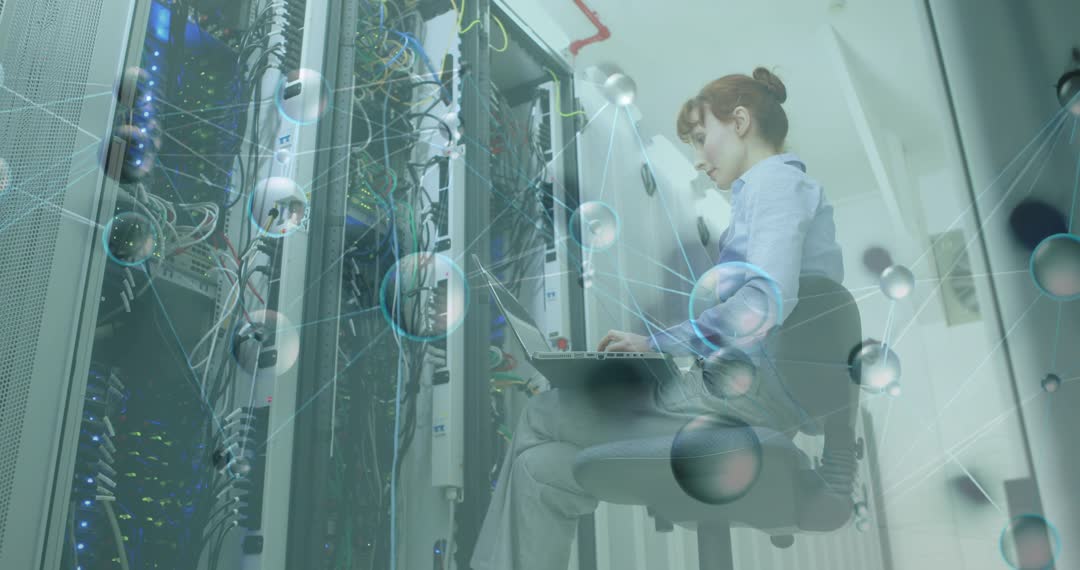 Technician using laptop conducts diagnostics and data analysis amidst complex cabling in server room. Spheres symbolically display data flow, representing modern digital infrastructure importance in IT. Picture epitomizes technology environments focusing on cybersecurity and connectivity. This ideal for educational or marketing materials spanning digital networking and enterprise technology sectors.