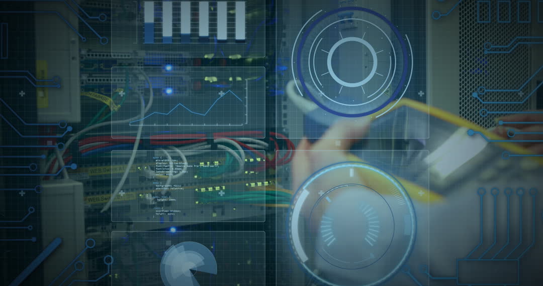 A technician holding a device examines servers with interactive digital graphics overlay, representing data analysis in a modern tech environment. Perfect for illustrating concepts of data management, technology advancement, and IT workforce. Ideal for use in tech blogs, IT service advertising, and educational content on networking and server management.