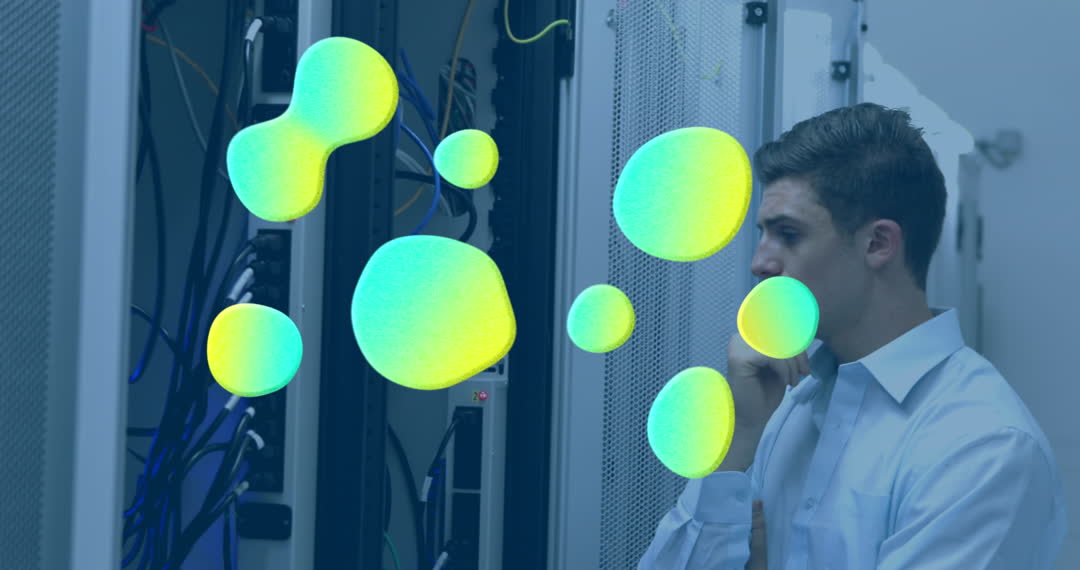 Caucasian male technician focusing on server equipment with abstract design overlay represents the intersection of technology and creativity. Useful for articles on IT solutions, digital transformation, and innovations in tech environments.