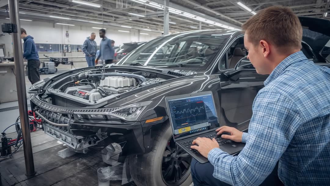 AI Generated Image. Featuring technician diagnosing electric sedan using laptop telemetry and live performance readouts inside busy workshop. Close-up showing laptop screen displaying waveform graphs, battery management metrics, and sensor logs while technician adjusting parameters and entering diagnostic commands. Wide-angle showing team of mechanics working on other vehicles, creating sense of quality control and production workflow. High-contrast lighting highlighting glossy vehicle panels and emphasizing modern industrial atmosphere. Use cases: Suitable for EV service center marketing, technician training courses, automotive repair tutorials, software vendor demos, corporate aftersales presentations, editorial coverage of electric vehicle technology, social media campaigns promoting diagnostics. Composition suggestions: Use wide crop for video opener, medium close-up for tutorial segments, tight crop on laptop screen for technical overlays. Color grading suggestions: Cool tones for high-tech feel, warm highlights to emphasize human element.