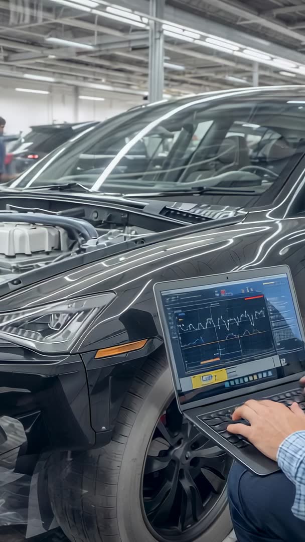 AI Generated Image. Technician diagnosing electric SUV using laptop while logging waveform telemetry from onboard sensors. Close-up vertical video focusing on front fender, headlight, open hood, diagnostic screen showing live waveform graphs and sensor readouts. Workshop environment with multiple vehicles in background, bright overhead lighting, clean service bay. Usage ideas: - Training technicians diagnosing EV powertrain, battery management, and electronic control units - Marketing clips for dealership service centers, independent repair shops, and EV maintenance campaigns - Technical tutorials covering ECU tuning, CAN bus diagnostics, sensor calibration, and data logging workflows - B-roll for news segments, corporate videos, product demos, and technology stories about electric vehicles - Social media vertical content for Instagram Reels, TikTok, and YouTube Shorts Visual notes: - Emphasis on hands operating laptop keyboard and live telemetry on screen - Reflective black SUV surface adding premium, high-tech aesthetic - Vertical format optimized for mobile-first platforms and short-form video content