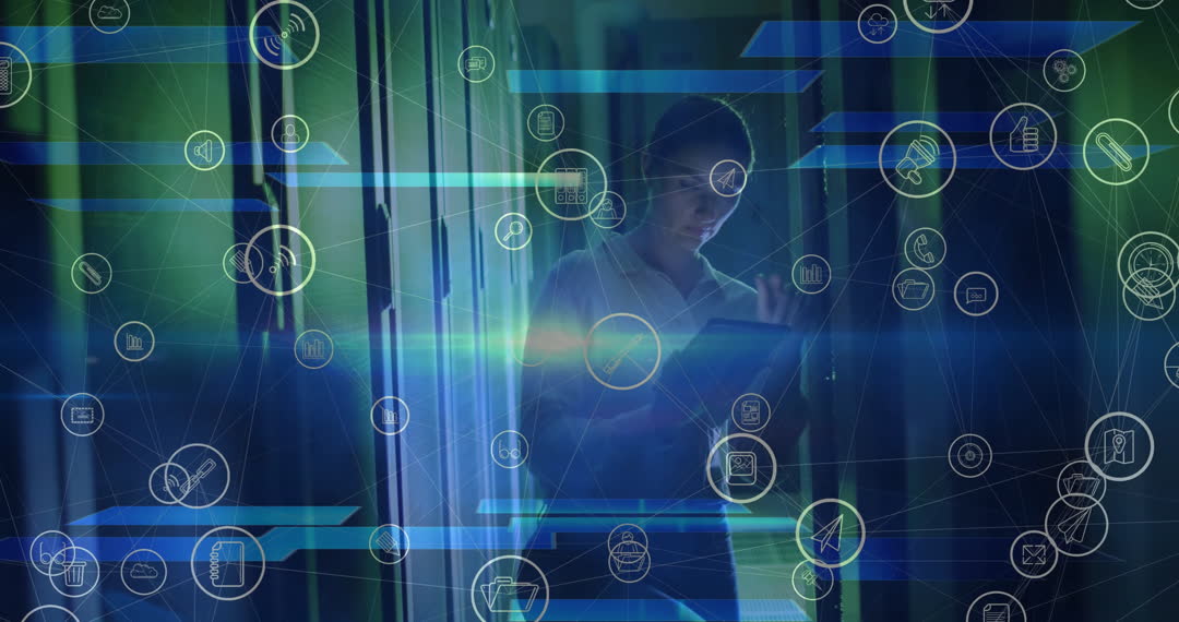 Image of a female technician working in a dimly lit server room with overlaid digital icons representing data and communication. Ideal for illustrating concepts in technology, data management, and digital innovation. Useful for websites or materials focused on IT services, data storage solutions, or cloud computing systems.