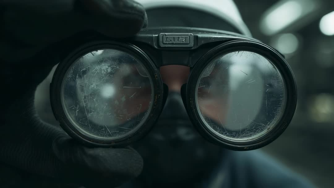 AI Generated Image. Close-up video showing technician wearing gloves and helmet, bringing scratched binoculars close to camera while inspecting lenses in dimly lit workshop. Hands rotating eyepieces and angling optics, light reflecting off scuffed glass, shallow depth of field producing soft bokeh background. Scene conveying careful equipment check, field maintenance, tactical gear inspection, or product condition assessment. Ideal for use in training videos, repair tutorials, industrial safety content, military or outdoor gear marketing, documentary sequences, and cinematic suspense scenes. Color grading and cropping options suggested for gritty technical mood or polished commercial look, with emphasis on texture, wear, and hands-on procedure.