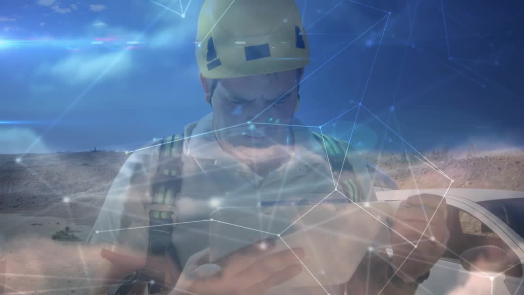 A technician in protective gear interacts with a tablet against a backdrop of futuristic digital overlays. This scenario illustrates the integration of cloud technology in fieldwork and data management. Ideal for showcasing advancements in engineering and the importance of connectivity in remote work environments, this visual can enhance presentations on innovation, tech solutions, or remote data analysis.