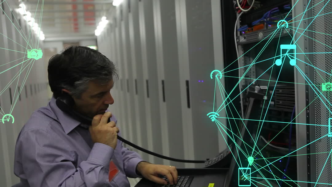 Technician Troubleshooting Servers with Network Icon Overlay Video