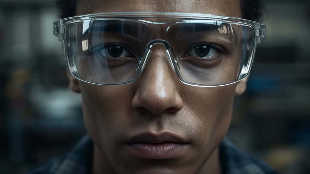 AI Generated Video. Showing close-up video frame of male technician wearing clear safety goggles and flannel shirt, gazing steadily into camera with focused expression. Background blurred workshop suggesting manufacturing shop floor and metalwork environment. Lighting creating cinematic mood with soft highlights on skin and reflective goggles. Composition emphasizing eyes and protective eyewear to convey safety focus and human element in industry. Serving as hero shot for industrial safety campaigns, PPE training videos, manufacturing company websites, technical blog headers, recruitment ads, factory tour videos, documentary sequences, and corporate training materials. Suitable for B-roll, opening title sequence, thumbnail art, and visual storytelling about workplace safety, skilled trades, and hands-on engineering. Editing tips: Apply subtle color grading to enhance cool industrial tones, add gentle vignette for focus, and preserve reflections in goggles for realism.