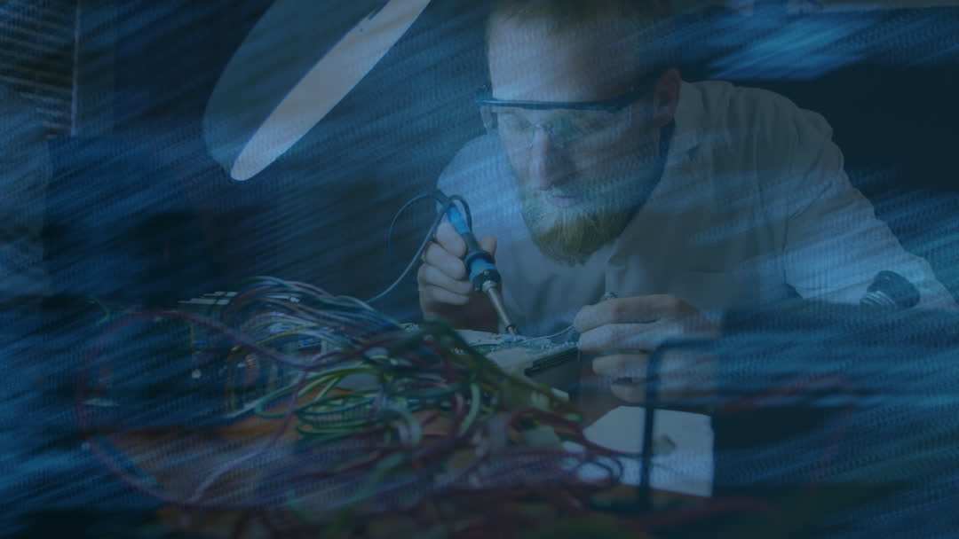 Image featuring a technician, wearing safety goggles, performing soldering tasks on electronic components under laboratory lighting with an overlay of blue digital effects. Perfect for illustrating modern technology practices, electronic engineering concepts, or visuals depicting innovation and future tech. Useful for articles or advertisements related to advancements in tech and laboratory work.