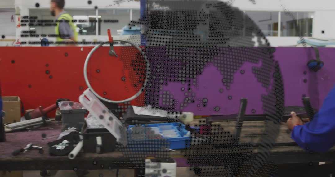 Technicians assembling steel frame at workbench with dotted globe overlaying industrial workflow Video