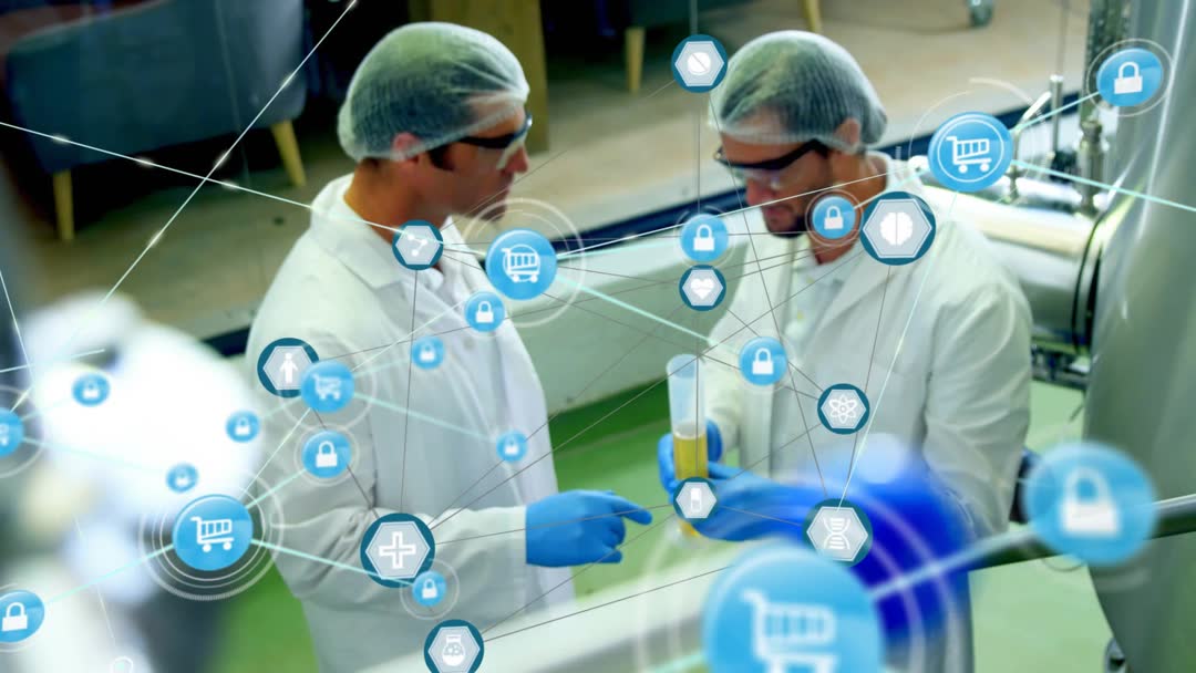 Scene showing two lab technicians in protective gear inspecting cylinder of yellow liquid beside stainless steel piping while augmented IoT icons and network lines visualize sensor data and quality metrics. Composition featuring close-up on hands and sample with shallow depth of field, blue data icons floating across frame to emphasize connectivity between sensors and production equipment. Video useful for illustrating food safety programs, quality control workflows, manufacturing automation, smart factory initiatives, IoT monitoring, and process validation. Ideal for corporate training videos, product pages, industry reports, news segments, website hero banners, technical presentations, and social media content. Editable space available for on-screen text, lower-third captions, and logo placement. Color palette dominated by cool blues and sterile whites, conveying cleanliness, precision, and technology. Licensing suggestions include marketing, educational content, investor decks, regulatory compliance materials, and trade publication features.
