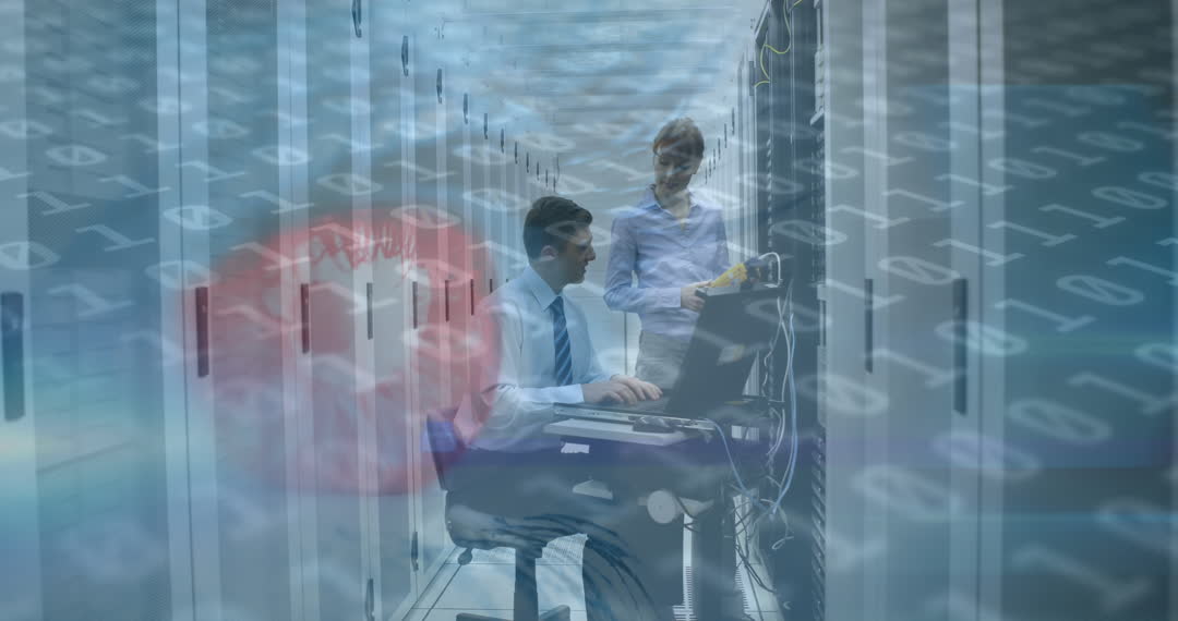 Technology professionals in a data center examine server melee as binary code and a digital eye scan overlay emphasize the data-driven, secure nature of their work. Useful for illustrating digital technology environments, IT teamwork, data security concepts, or innovation in tech-focused marketing materials.