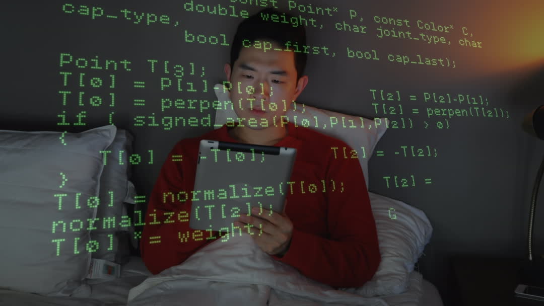 Depicting a person engaged in coding and technology in a digital setting. Suitable for illustrating concepts related to software development, virtual teamwork, and the increasing role of technology in everyday life.