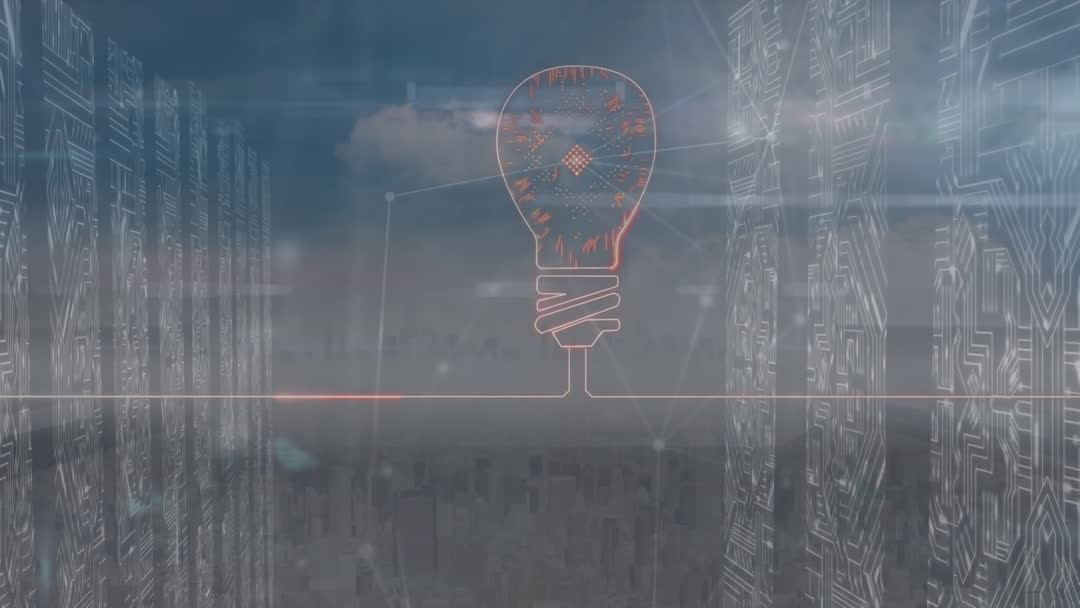 A dynamic representation of modern technology blending a digital light bulb over a city landscape illustrates the binding of innovation and global connectivity. It signifies endless possibilities in tech development. Ideal for marketing presentations focused on innovation, digital transformation projects, or technological breakthroughs highlighting connectivity and growth.