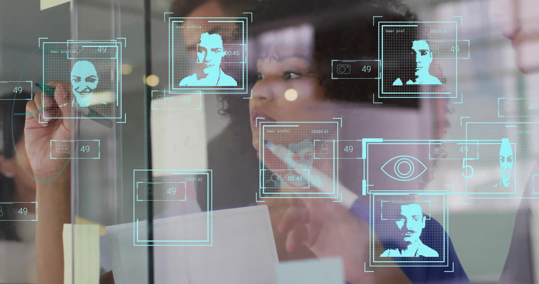 Professionals engage with advanced biometric technology in a business setting, highlighting the integration of data processing and innovation in workplaces. Perfect for illustrating futuristic business environments, technology in action, and the impact of digital solutions in everyday office life.
