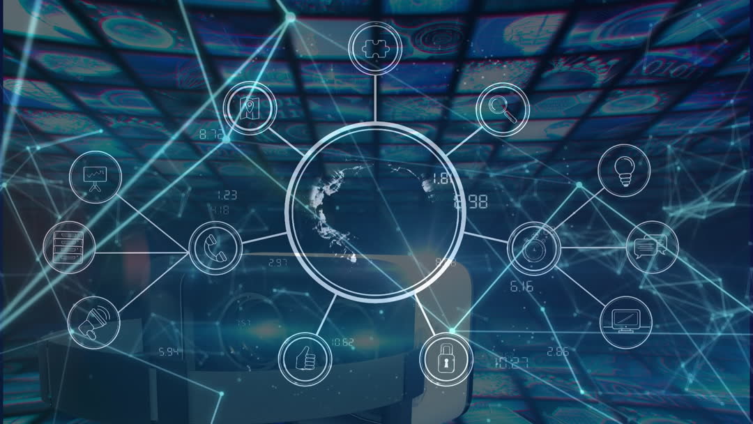 A visual of interconnected global technology symbols and data on a blue animated background. Suitable for illustrating concepts such as digital communication, global networking, cybersecurity solutions, futuristic technology projects, or content featuring the era of advanced digital interfaces.
