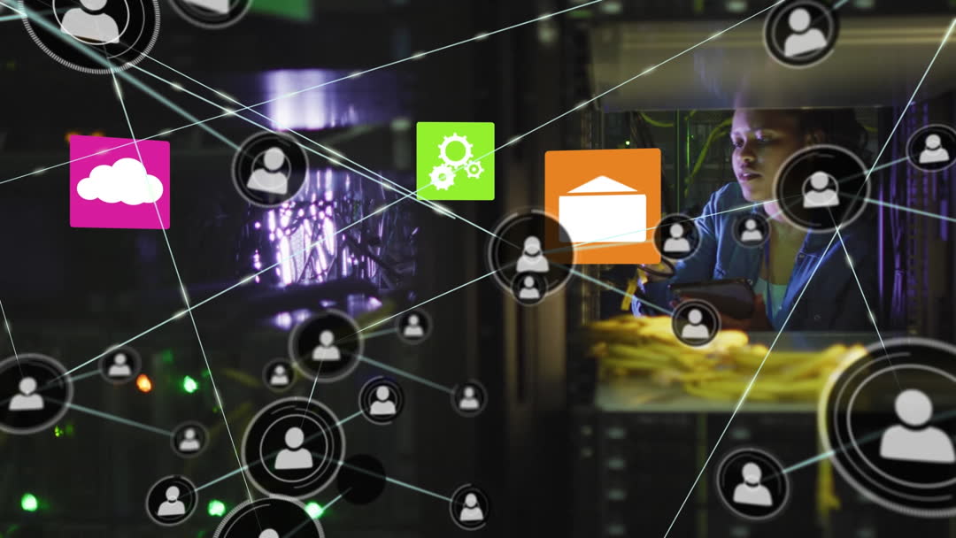 Image depicts a digital network intertwined with virtual icons representing cloud computing, communication, and software features. African American woman deep in thought is writing code or developing software in cool lighting. Scene captures innovation and expertise in digital systems and is suitable for illustrating technological advancement, teamwork, and modern processes in tech advertisements or educational materials.