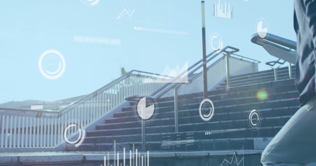 Frame showcases a technology-driven narrative of a mature adult going up stairs met with various futuristic data visuals symbolizing business progress and technological innovation. Great for illustrating growth, corporate stride, or tech advancement in modern sectors. Useful for business development presentations, technological innovation discussions, and motivational themes centered around consistent progress and achievement.