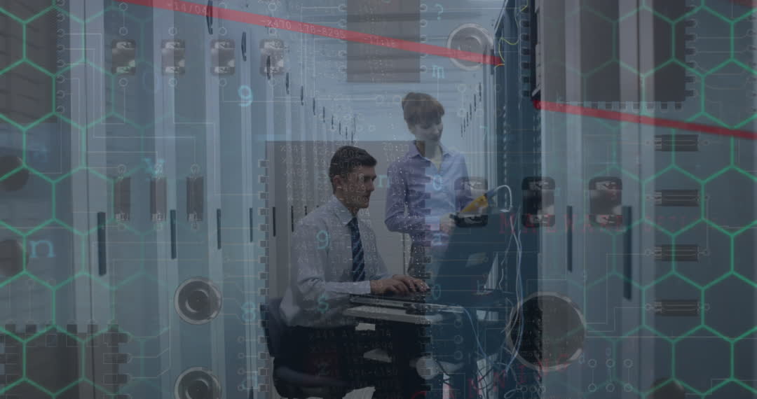 Caucasian male and female engineers collaborating in modern server room overlapped with digital technical representations of microprocessor connections, illustrating themes of data management and innovation. Useful for highlighting technology professions, server maintenance, cybersecurity, cloud storage, or digital business solutions visuals.