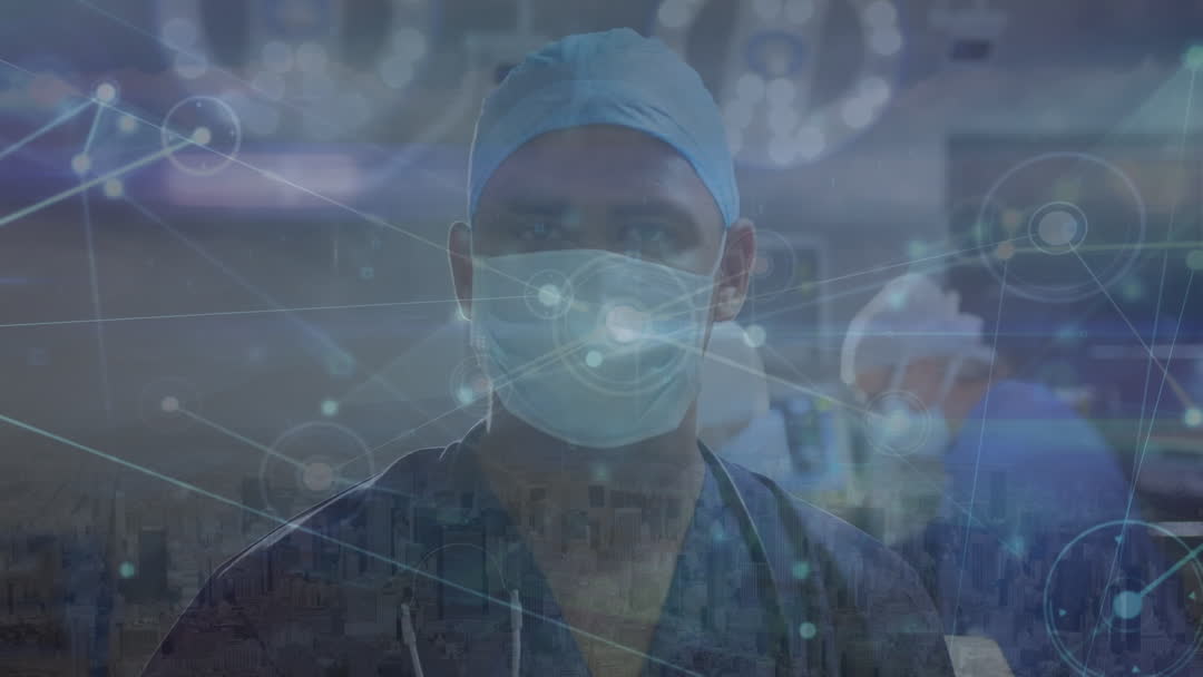 Showcasing a surgeon in an advanced operating room, overlaid with digital network graphics, symbolizing the integration of technology and healthcare. Useful for illustrating themes of innovation in medicine, the future of healthcare technology, or promoting high-tech medical services.